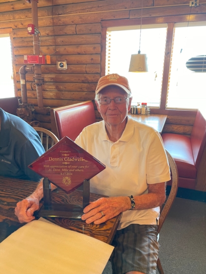 Here is a photo taken by Madeline. Dennis received a plaque for his humanitarian service to his friends and classmates. It was to have been presented at the Reunion but Dennis had to leave before that point in the program.